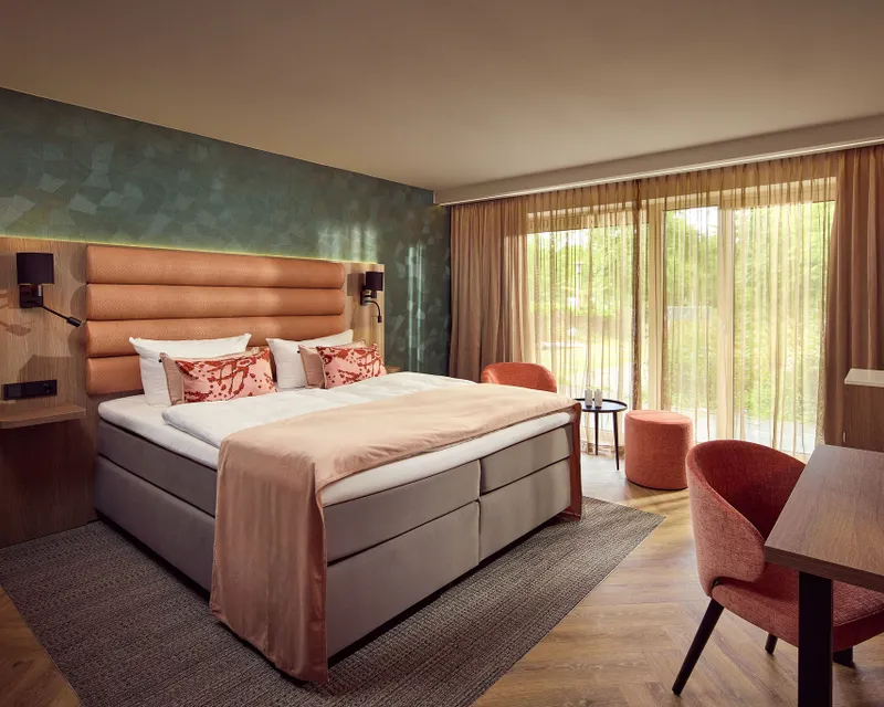 Our fully renovated executive Rooms for up to 4 people combine stylish design with modern comfort. The rooms feature twin beds and a bunk bed with two single beds, each equipped with its own TV panel. A comfortable sitting area, a flat-screen TV with international channels and streaming function, as well as a desk provide the perfect setting for both relaxation and work. Additional amenities include a kettle, a coffee machine, and an unstocked fridge. The bathroom is fitted with both a shower or a bathtub, toilet, and hairdryer. Furthermore, the rooms offer a wardrobe, a safe, air conditioning, a terrace or balcony, and complimentary Wi-Fi.