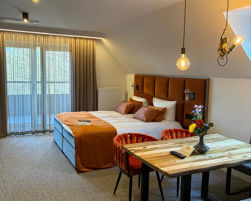 Our completely renovated family suite offers generous space and modern comfort for the whole family. With a total of seven beds and a large, cosy seating area, it is ideal for spending time together. Two televisions with international channels and streaming functions ensure the best entertainment. For added convenience, there is a kettle, coffee machine and minibar (not stocked). The suite has two bathrooms: one with a shower, bathtub and separate toilet, the second with a shower and toilet – perfect for families.