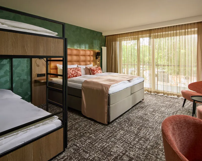 Onze volledig gerenoveerde familiesuites bieden veel ruimte en modern comfort voor het hele gezin. De suites beschikken over een comfortabel tweepersoonsbed, een stapelbed met twee eenpersoonsbedden en een aparte woonkamer met zithoek en extra flatscreen-tv. Zowel in de woon- als slaapruimte vindt u flatscreen-televisies met internationale zenders en streamingfunctie. Voor extra gemak zijn er een bureau, een waterkoker, een koffiezetapparaat en een niet-gevulde koelkast aanwezig. De badkamer is uitgerust met een douche en bad, toilet en haardroger. Daarnaast beschikken de suites over een kledingkast, een kluisje, airconditioning, een terras of balkon en gratis wifi.